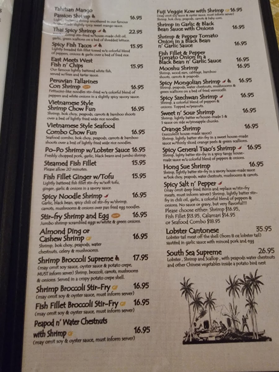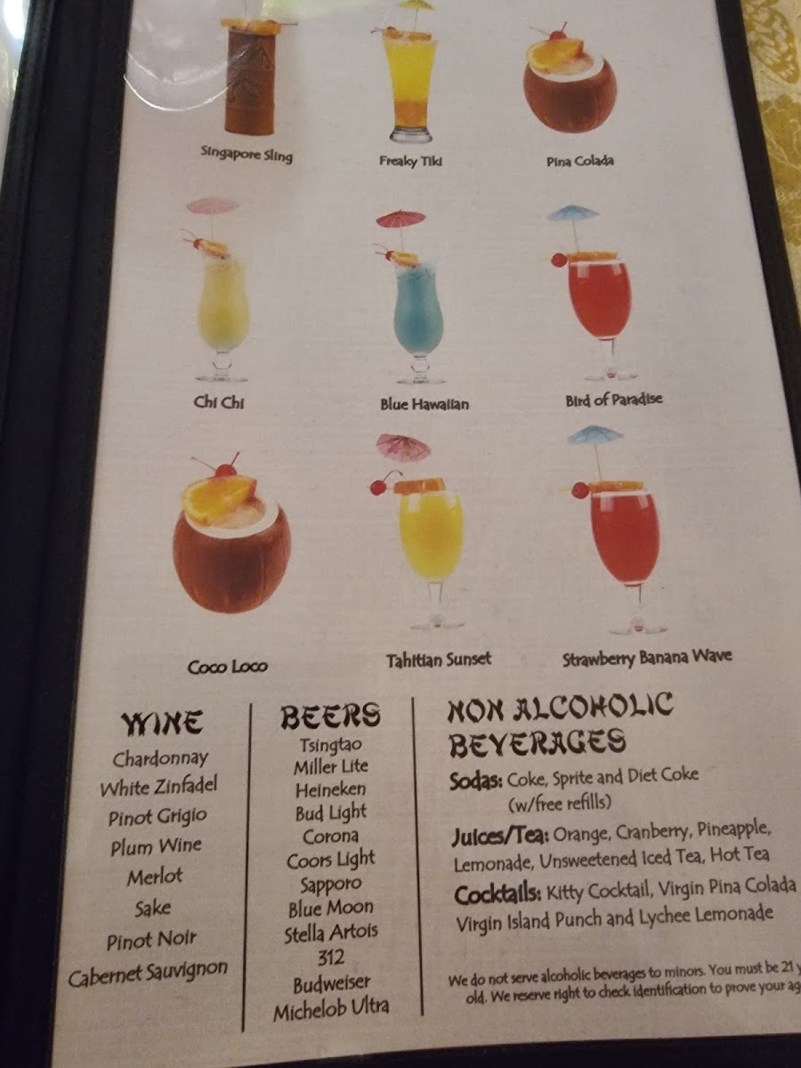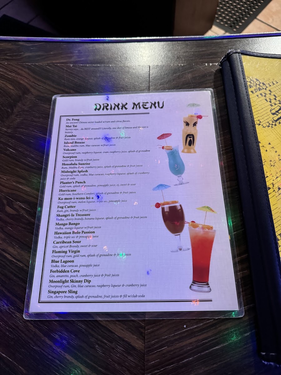 The menu accommodates a range of dining needs, from quick casual meals to catering orders, with dishes that are suitable for lunch, dinner, and group events. The selection reflects a blend of traditional Chinese cuisine with some Southeast Asian and tiki bar influences.
