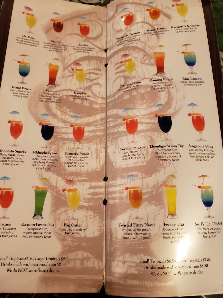 - Drinks and Tiki Bar Selections: Beverage options encompass both non-alcoholic and alcoholic choices, including iced tea, beer, and tiki bar specialties like the Mai Tai.