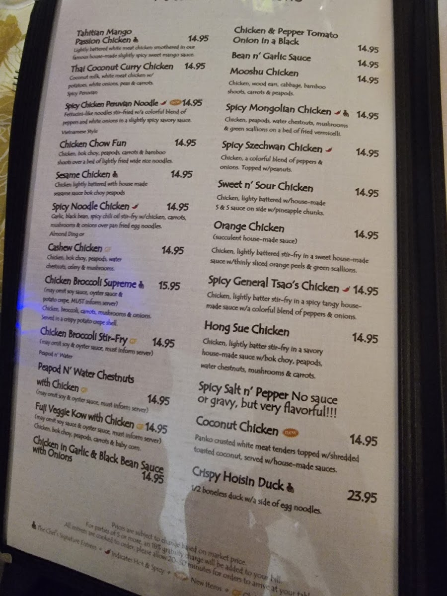 - Poultry Selections: Includes a variety of chicken dishes prepared with different regional influences and sauces, such as Tahitian Mango Passion Chicken, Thai Coconut Curry Chicken, and Spicy Peruvian Chicken with noodles.